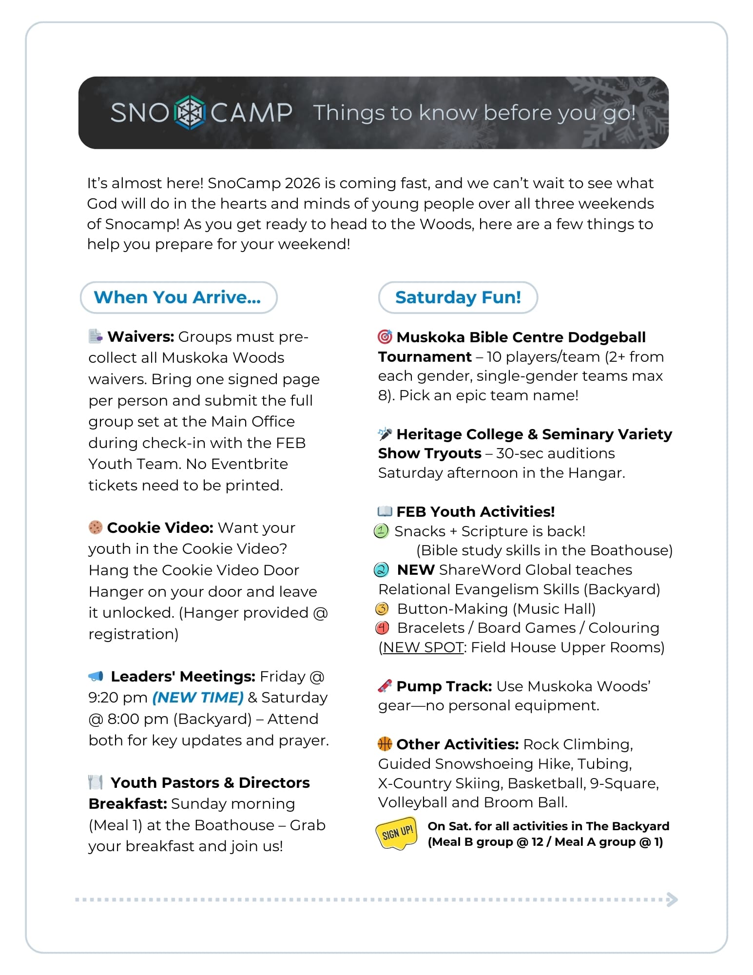 At Snocamp, high school students get to enjoy all of what Muskoka Woods has to offer while also being immersed in worship and teaching from God’s Word. Over and over, we hear from group leaders that Snocamp is a major highlight for them and their students every year. We take care of everything. Just get here and experience the weekend with your students.